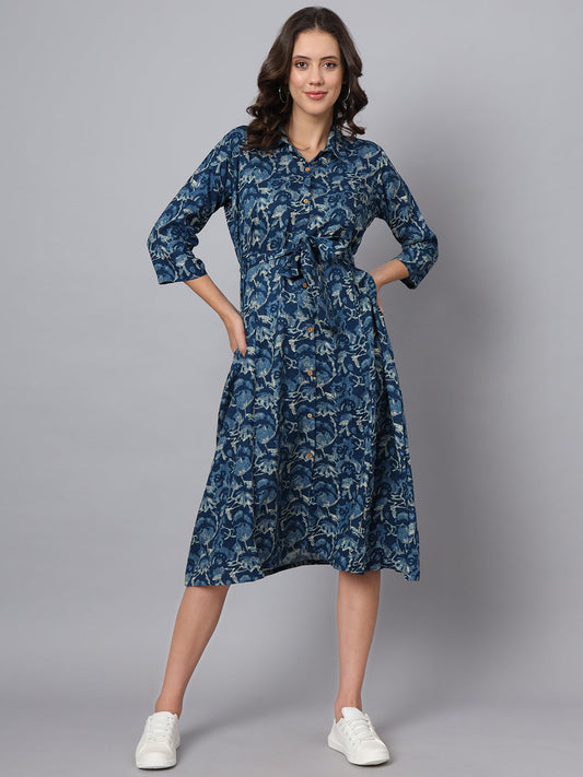 Indigo Blue Floral Print Pure Cotton Fit & Flare Dress