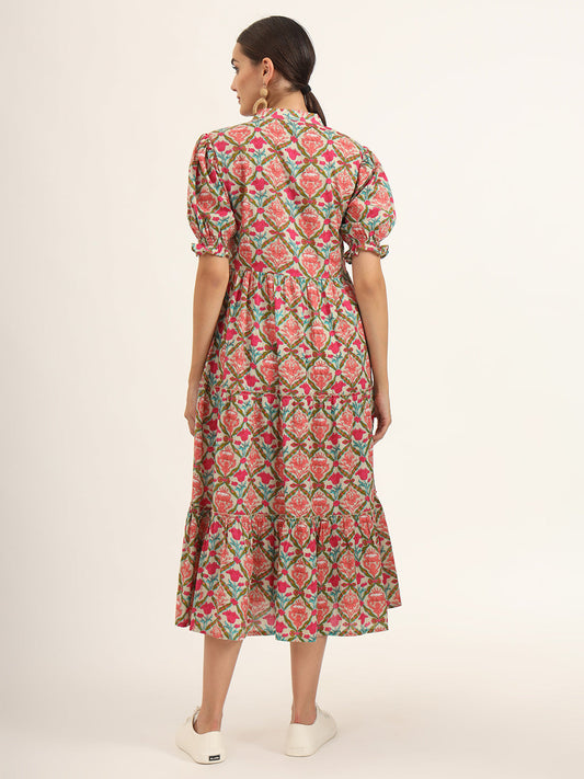 Brown Floral Print Pure Cotton Fit & Flare Dress