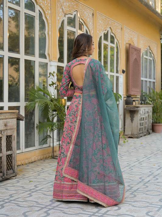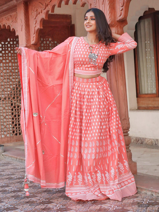 Green Printed Cotton Lehenga with Choli and Dupatta