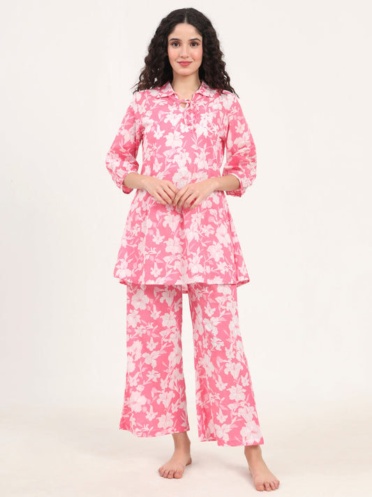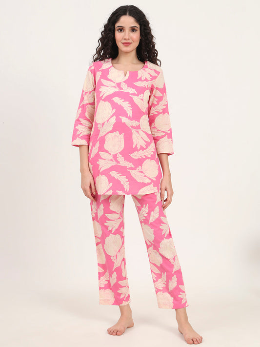 Pink Floral Print Cotton Regular Fit Night Suit