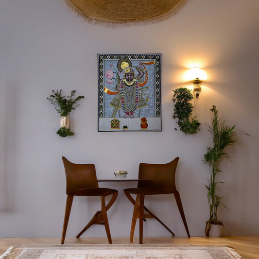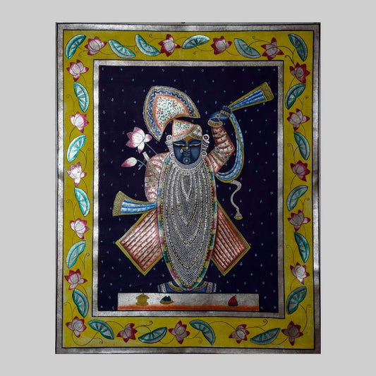 Pichwai art (also known as pichhavai, pichhvai, pechhavai etc) is a traditional form of painting that originated in Nathdwara, Rajasthan. These paintings are typically used as decorative backdrops in Hindu temples, particularly those dedicated to Lord Shrinathji or Krishna. Pichwai literally means ‘that which hangs from the back’ and comes from the Sanskrit words ‘Pich – back and Wais- hanging. Other than its artistic appeal, it is created with the intention to narrate the tales of Krishna to its devotees.