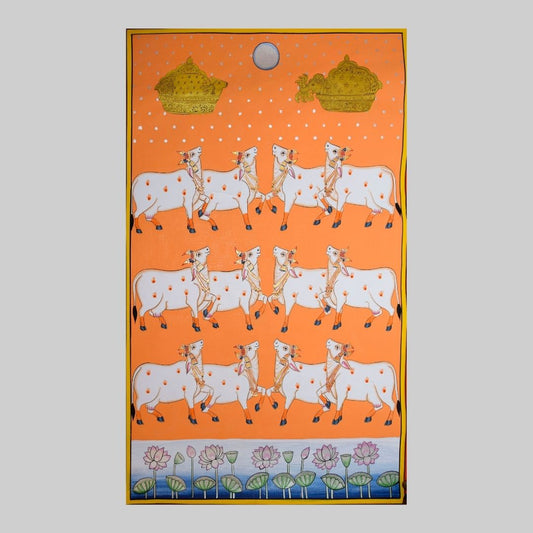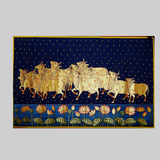 Golden Cow & Lotus Wall Traditional Pichwai Painting
