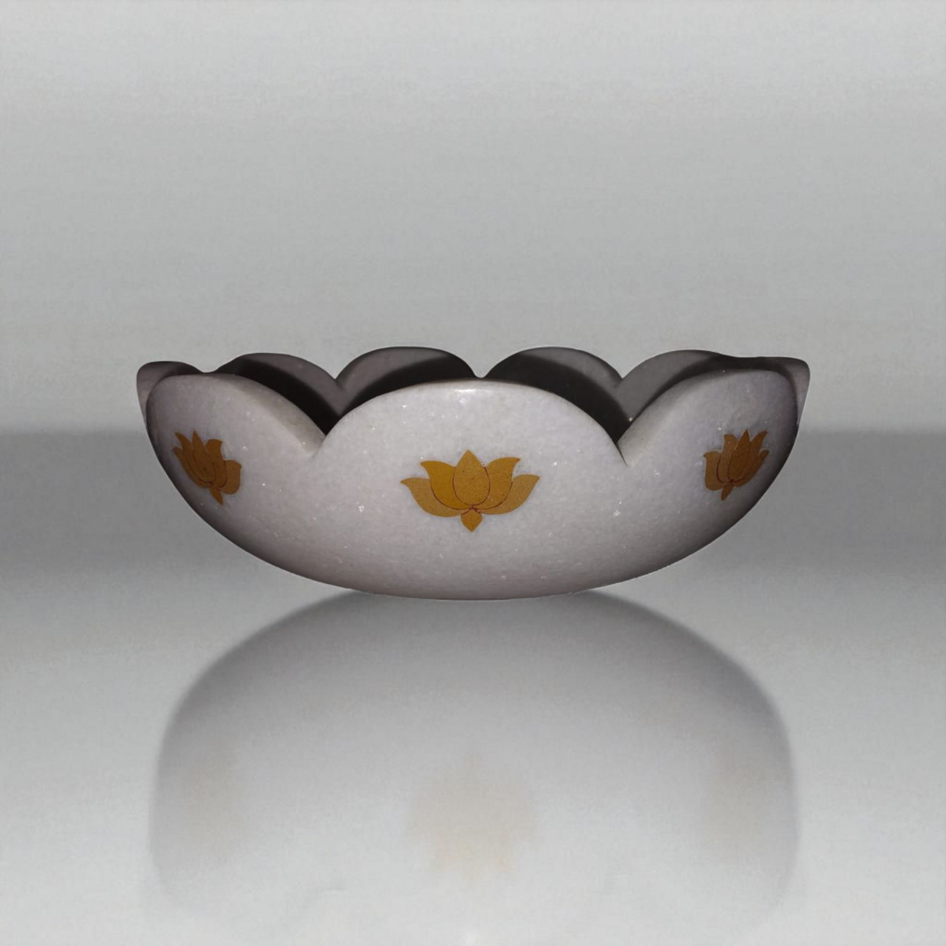 Bring timeless elegance to your bathroom with this handcrafted white marble basin. Designed with a scalloped edge and decorated with golden lotus inlay motifs on the outer surface, this luxury sink is a perfect blend of traditional artistry and modern style.