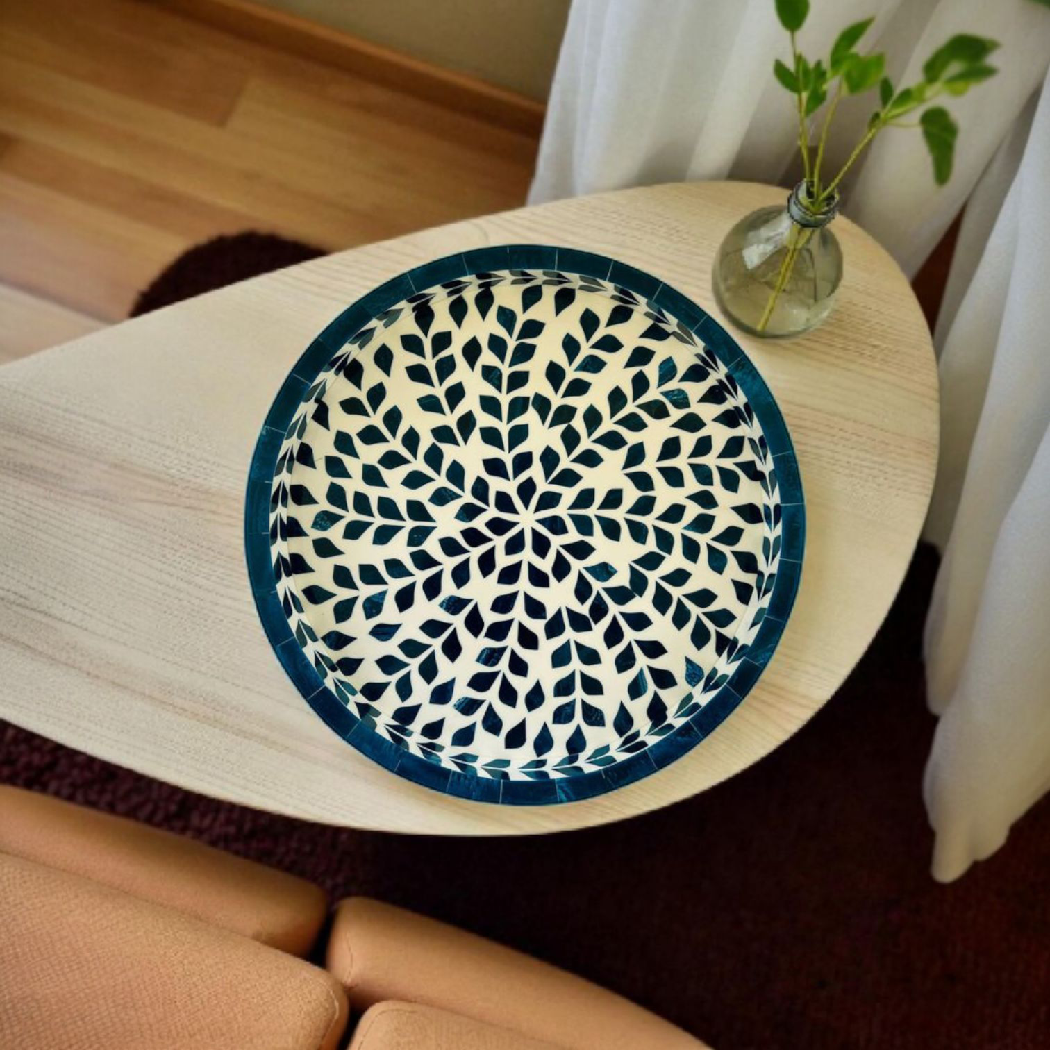 Elevate your home décor with this handcrafted Bone Inlay Leaf Tray, featuring an elegant blue and white leaf pattern. Made by skilled artisans, this round tray is both functional and decorative, perfect for serving drinks, snacks, or organizing essentials. Its intricate design adds a touch of timeless artistry to coffee tables, dining spaces, or console displays. Durable yet stylish, it makes a beautiful centerpiece and a thoughtful gift for any occasion.