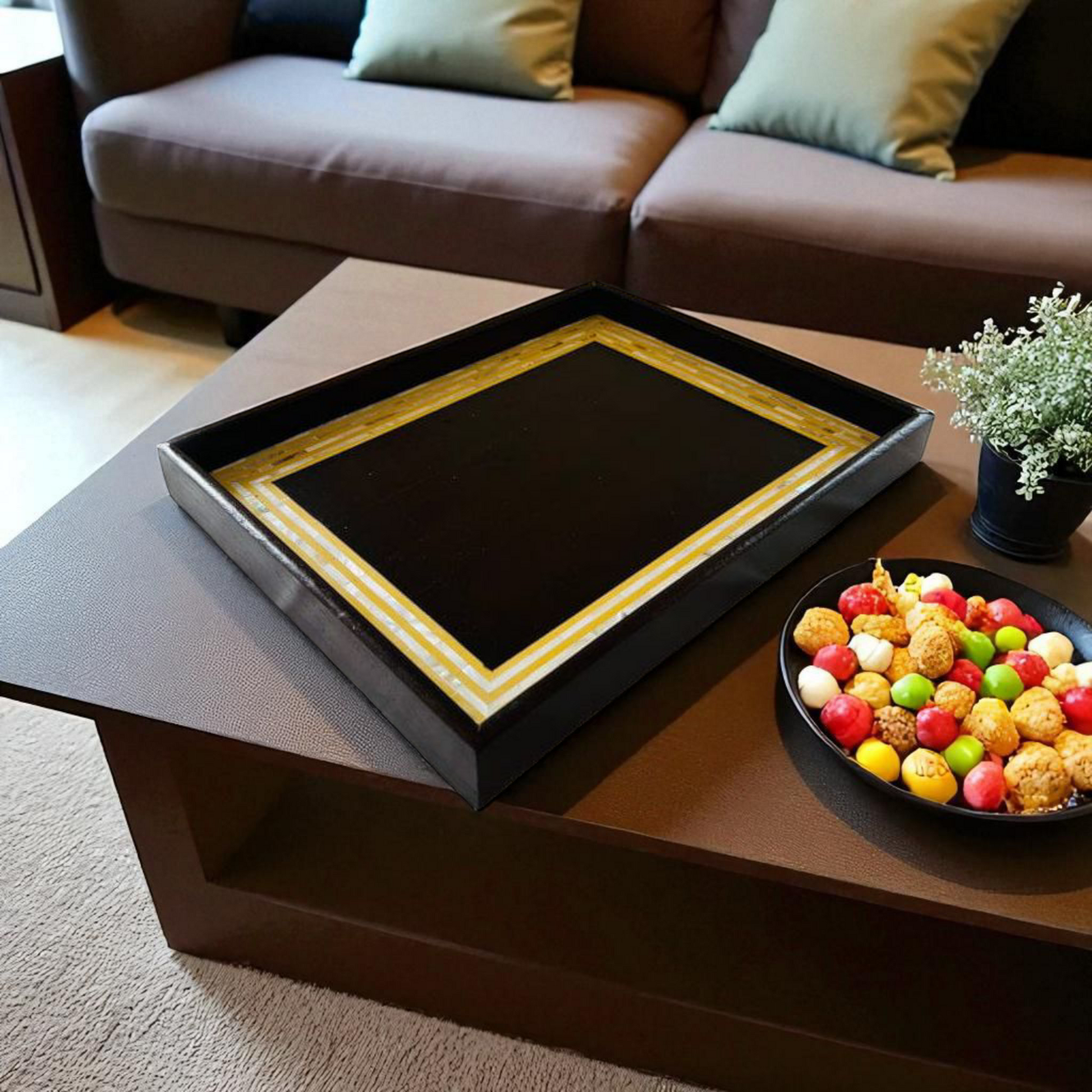 A luxurious handcrafted serving tray made from wood and adorned with mother-of-pearl inlay. The tray has a sleek black base with a rectangular border of shimmering mother of pearl, highlighted with golden-yellow detailing for an elegant finish. Its raised edges ensure stability when carrying items, making it both a decorative centerpiece and a functional serving accessory.