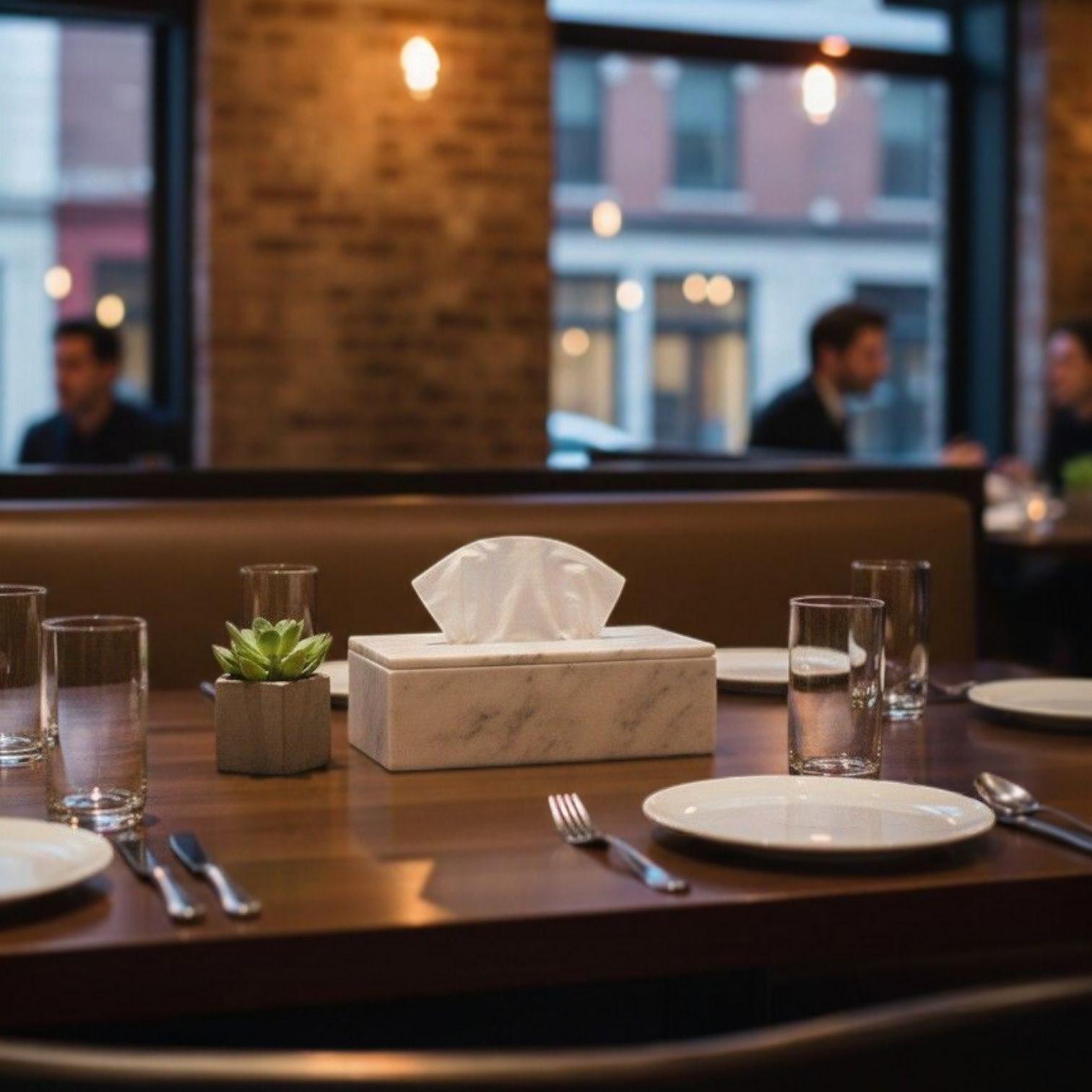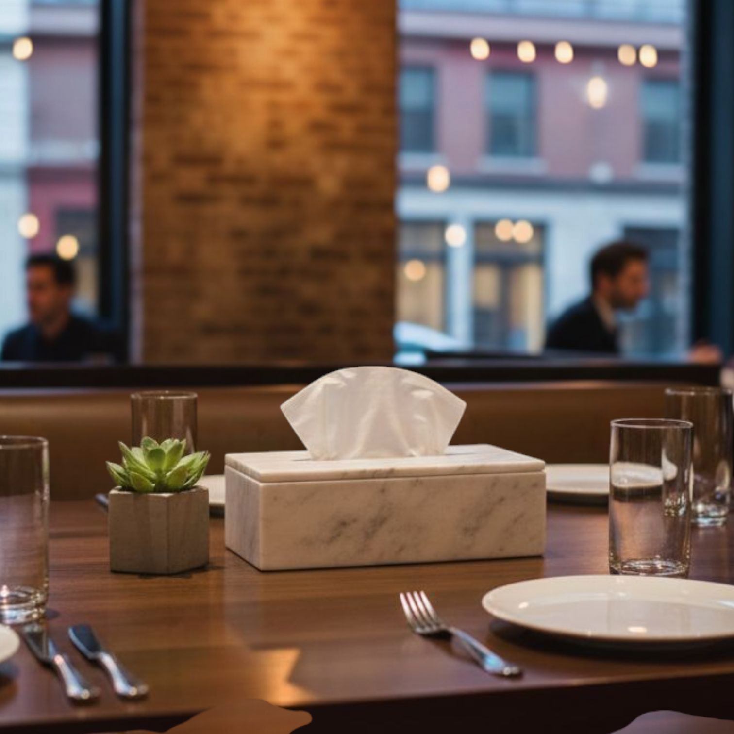 Handcrafted tissue box in premium natural white marble with elegant veining. Adds timeless sophistication to bathrooms, vanities, and living spaces.