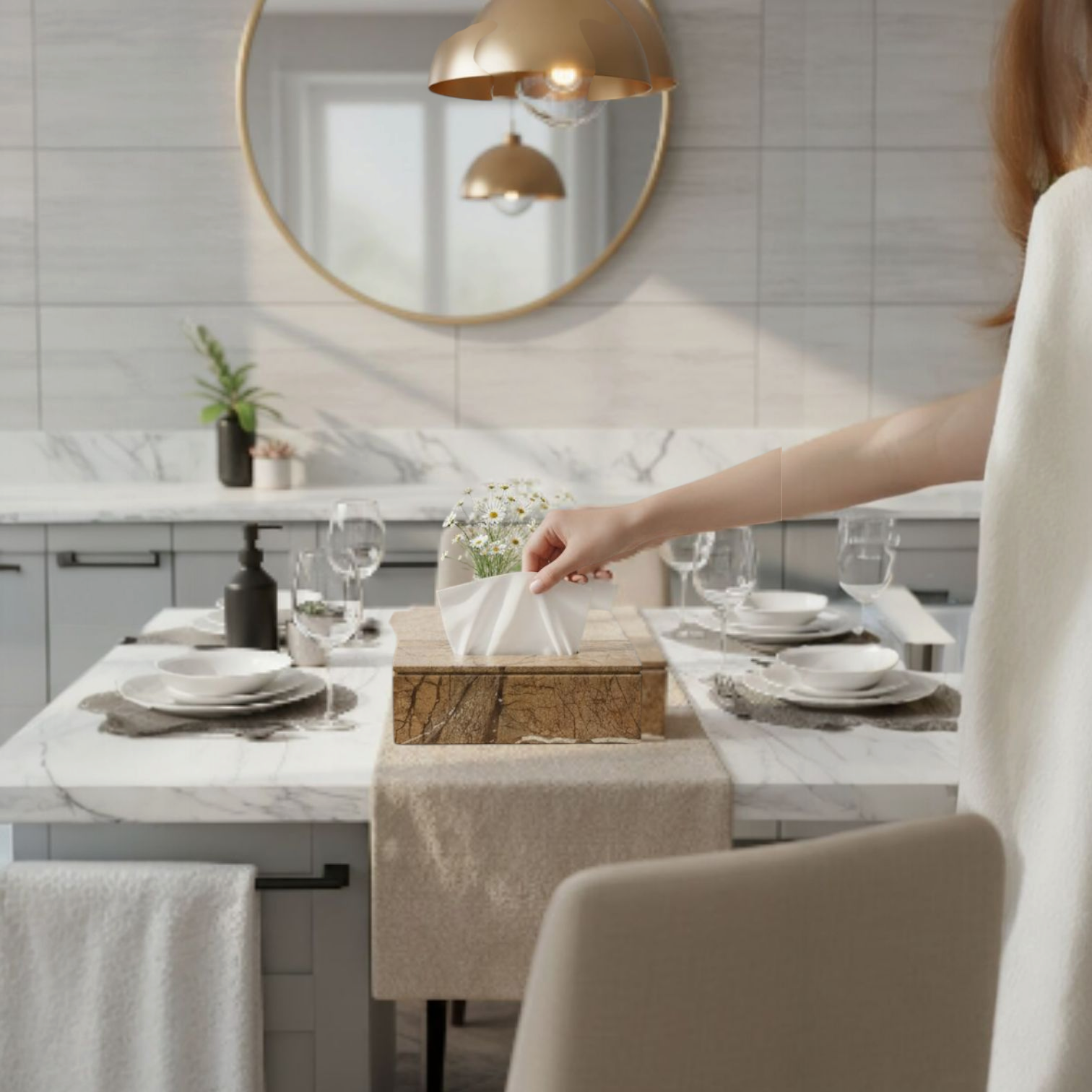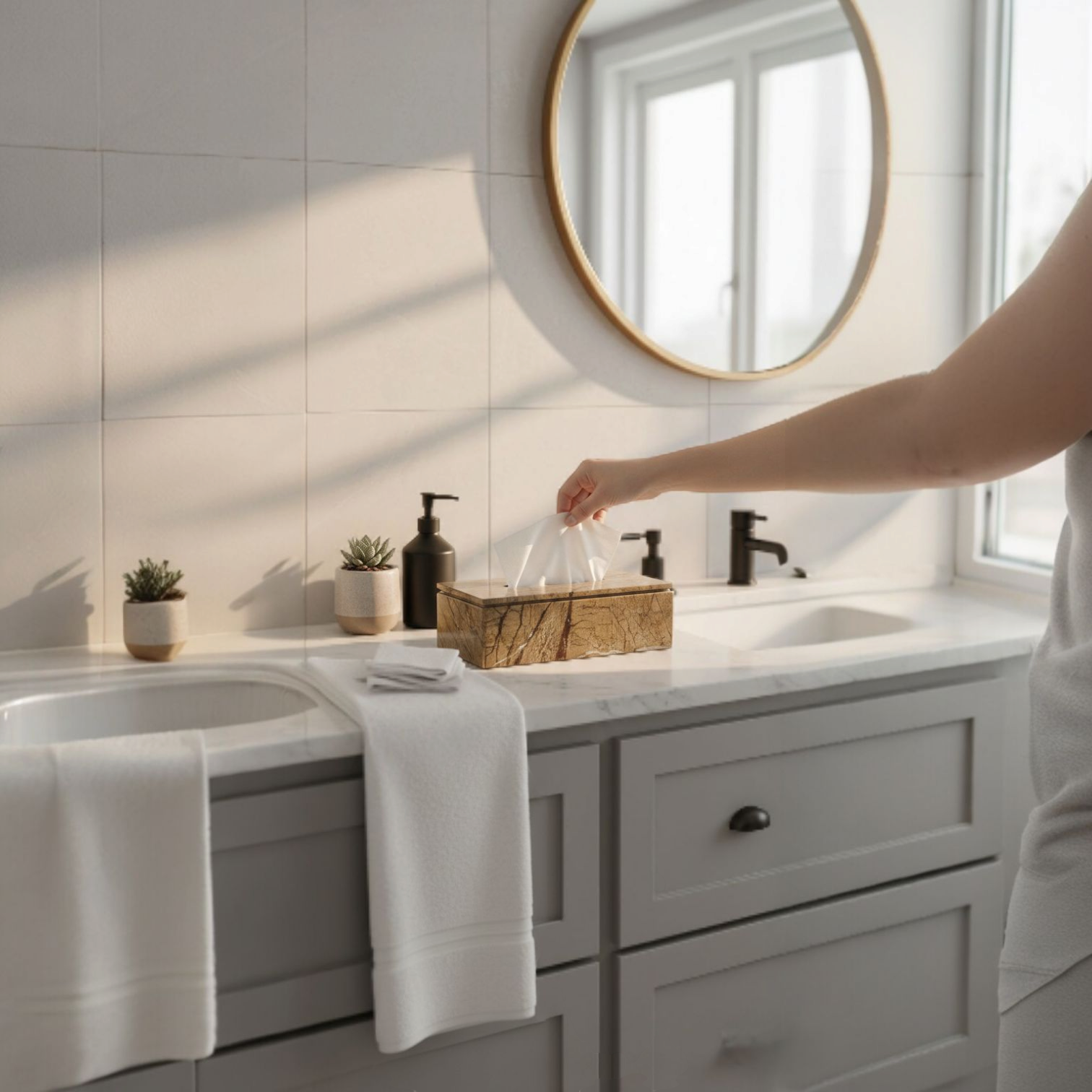 Handcrafted tissue holder in premium natural brown marble with unique veining. Adds refined elegance to bathrooms, vanities, and living spaces.