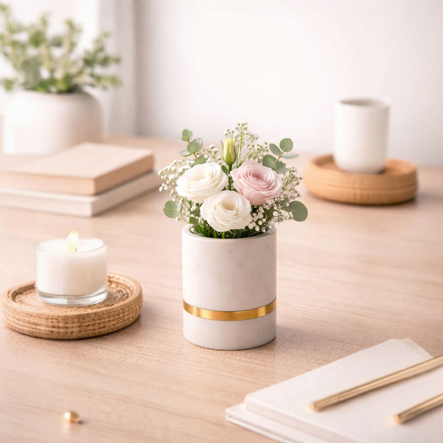 Elevate your workspace or vanity with handcrafted marble artistry and intricate brass inlay bands that bring timeless sophistication to your everyday essentials.