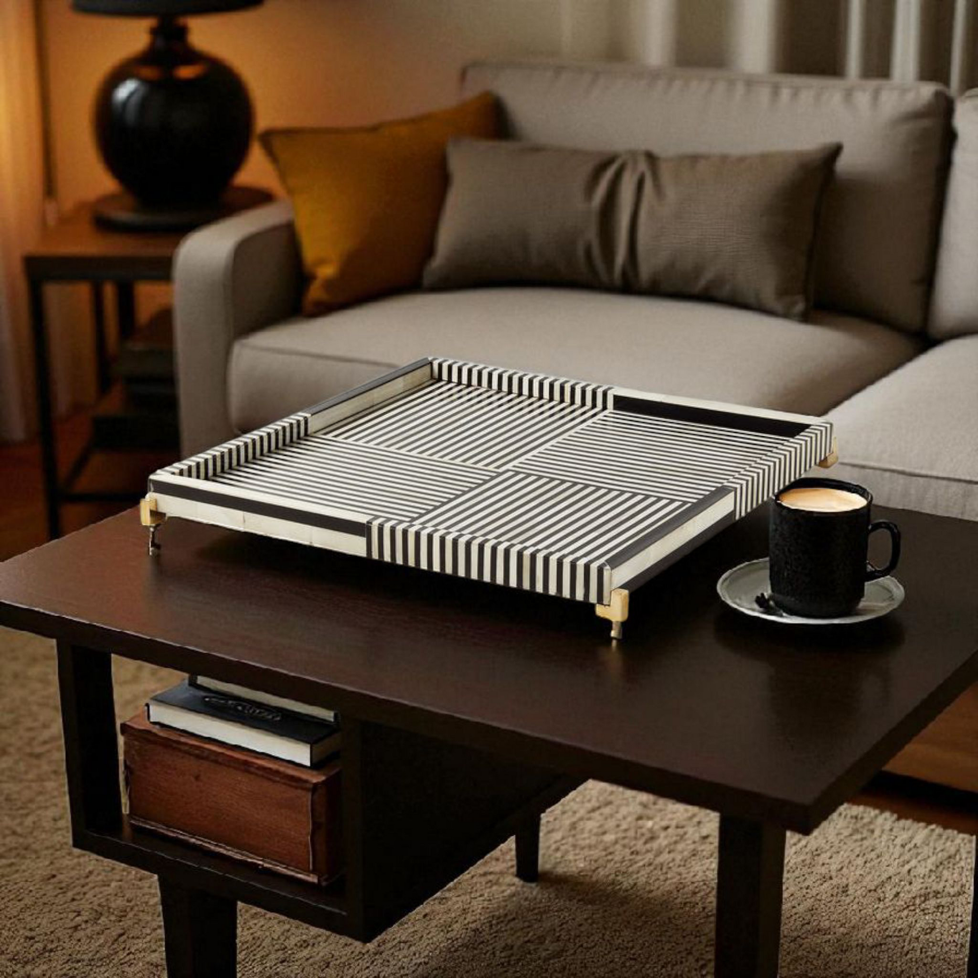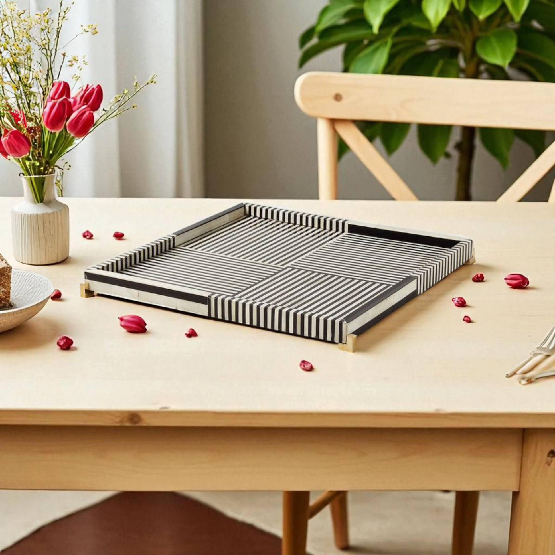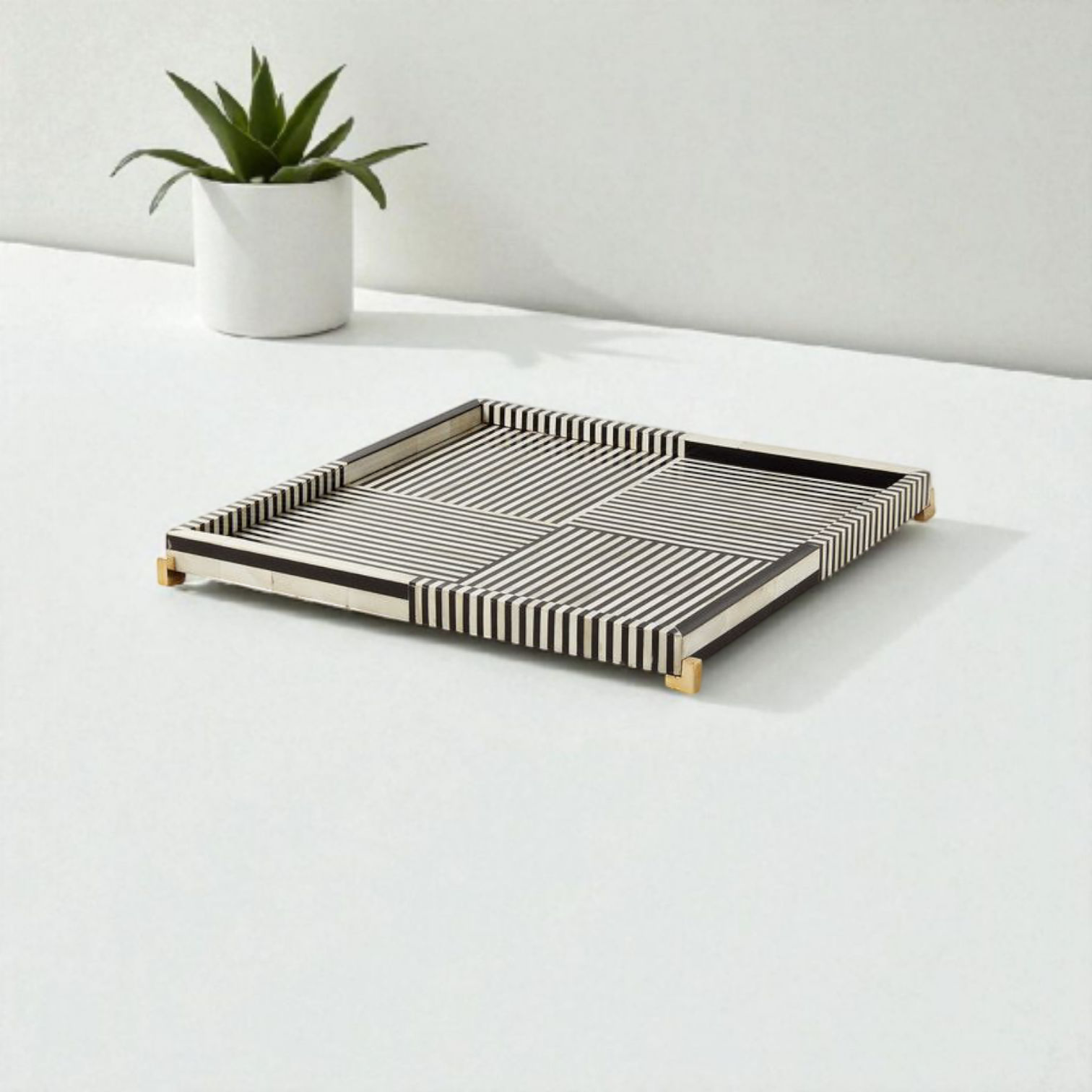 This elegant bone inlay serving tray showcases a striking striped pattern in black and white, handcrafted with precision by skilled artisans. Made using ethically sourced bone and resin, the tray is set on a sturdy wooden base with brass-finished corner accents for a touch of luxury. Its square shape and raised edges make it both functional and stylish, perfect for serving beverages, organizing essentials, or displaying decorative accents. A timeless piece that blends modern geometry with traditional craftsmanship, adding sophistication to any home décor.