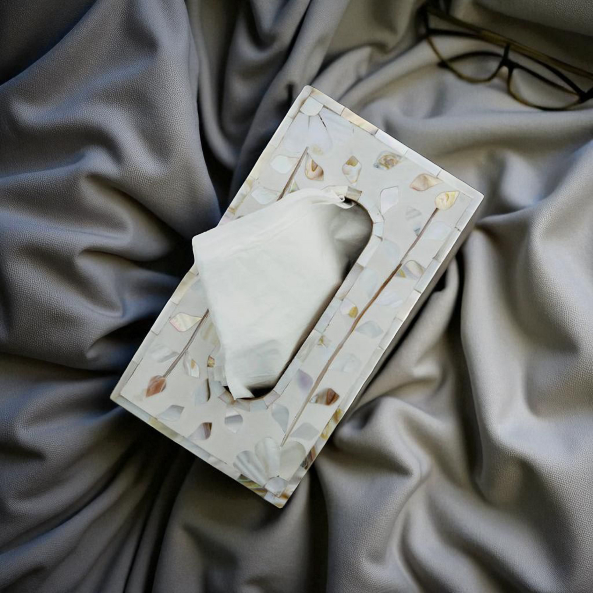 A handcrafted rectangular tissue holder made using delicate Mother of Pearl inlay work, set on a sturdy wooden base. The shimmering pearlescent pieces are carefully arranged in a floral and geometric pattern, giving it a luxurious and elegant appearance. The natural luster of the Mother of Pearl reflects light beautifully, making it both a functional and decorative accessory.
