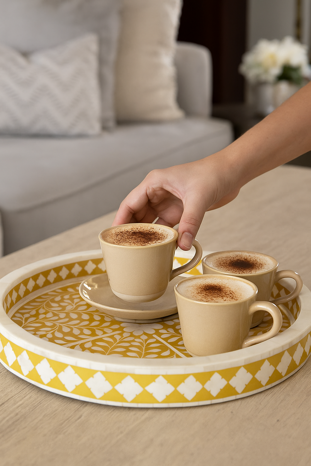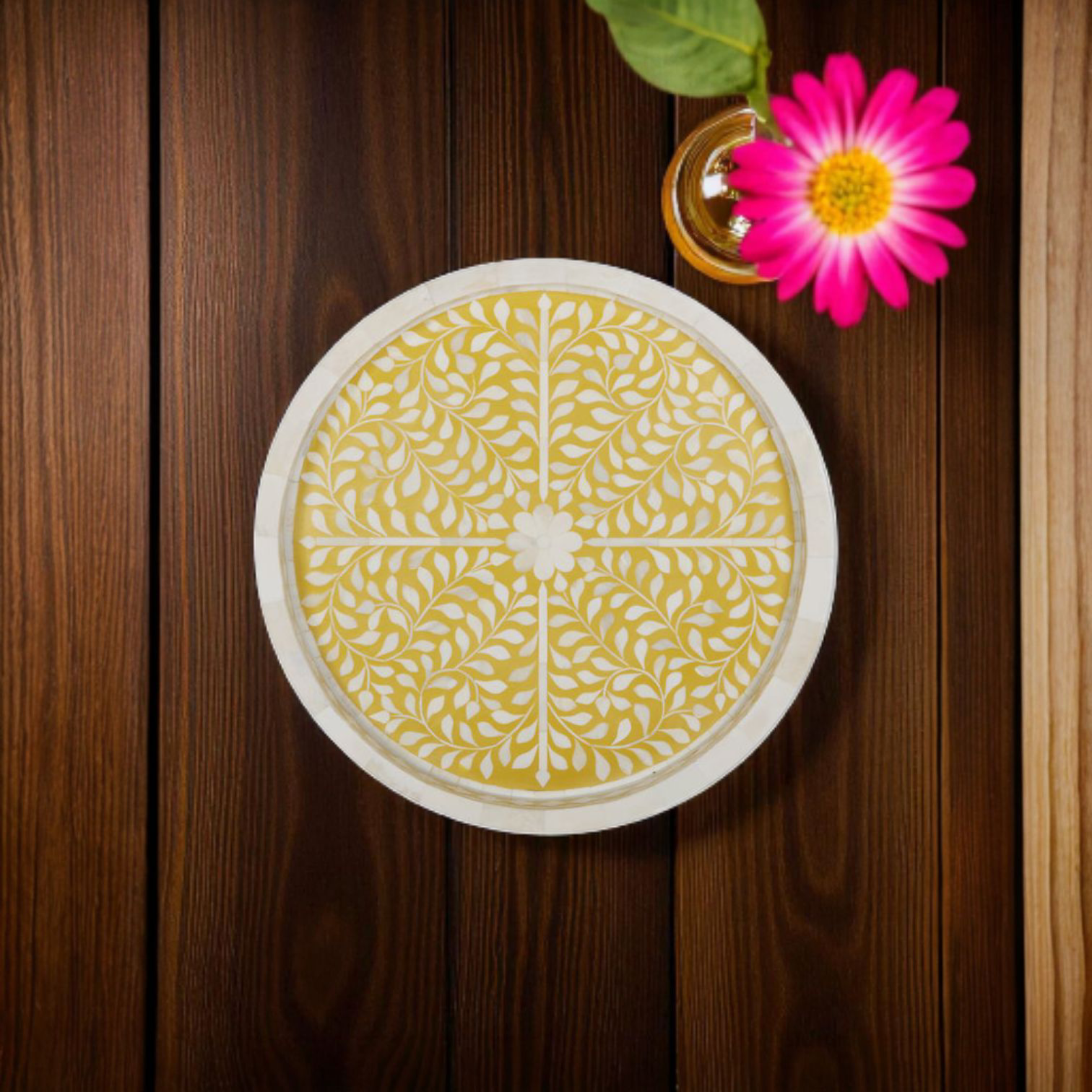 A handcrafted decorative tray featuring traditional bone inlay artistry. The tray has a circular shape with a raised edge, adorned in a striking yellow and white pattern. The base showcases a floral and vine motif, while the sides feature a geometric diamond border. Each piece of bone is meticulously hand-cut and inlaid into a resin background, making every tray unique. Ideal as a serving tray, coffee table centerpiece, or accent décor piece.